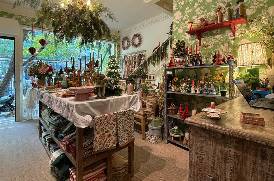 Ahora han desplegado toda su magia festiva, y al entrar te da la sensación de estar en una película navideña: adornos preciosos para el árbol, coronas, candelabros, mantelerías, vajillas, cristalería… y unos arreglos de flores artificiales taaaaan realistas que cuesta creer que no sean de verdad. Todo de un gusto y una calidad exquisita.