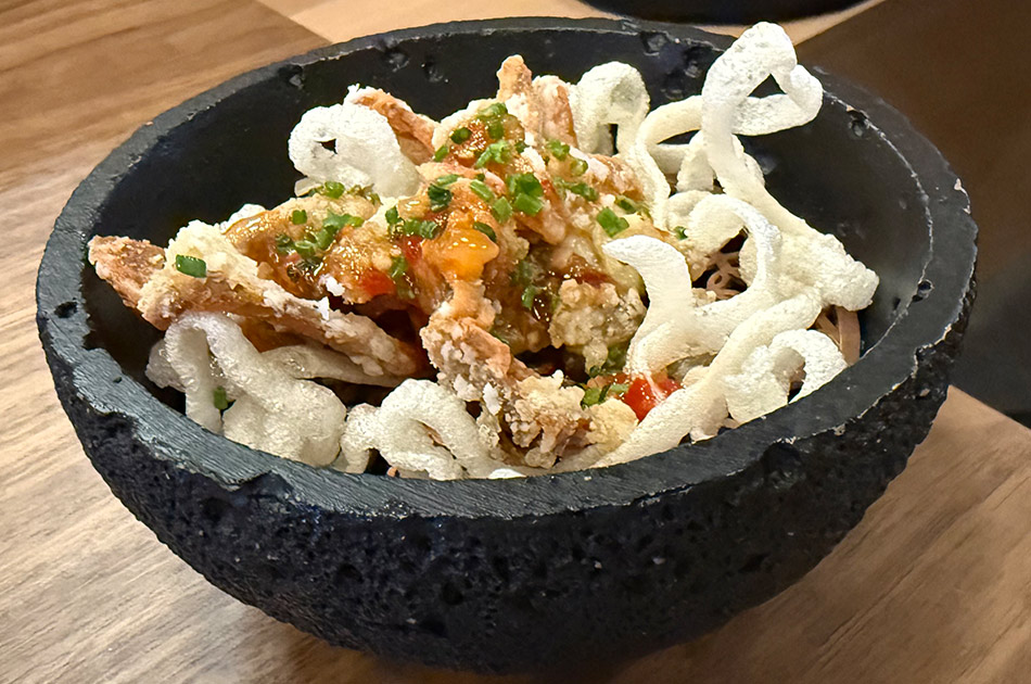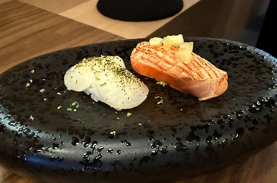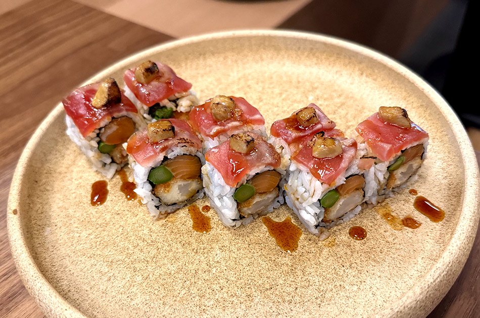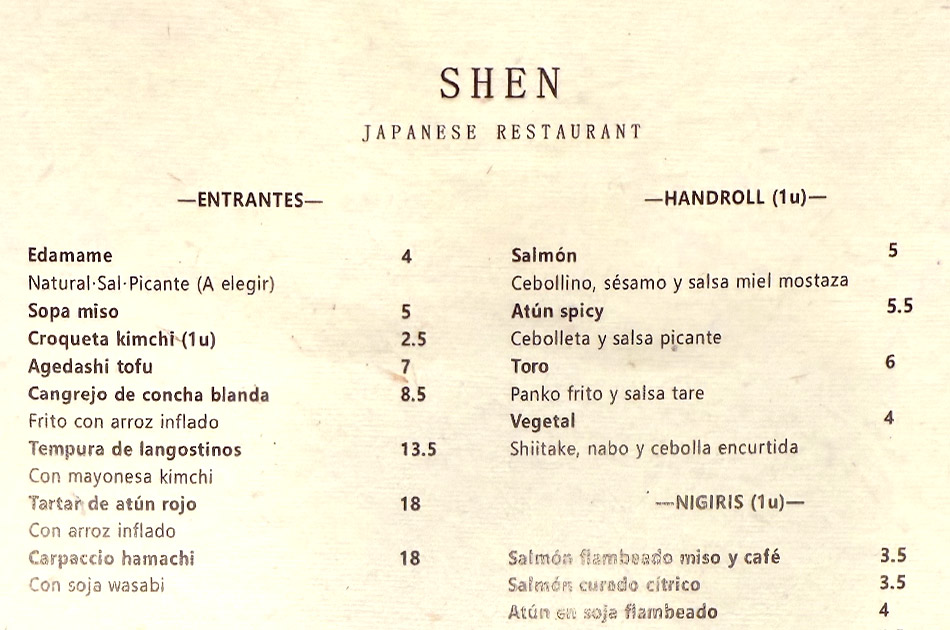 Restaurante SHEN. Calle San Joaquín, 14 (Metro Tribunal). Horario: abierto de lunes a domingo de 13:30 a 16:00 y de 20:30 a 00:00. Precio: cangrejo con arroz inflado 8,5 €; carpaccio de hamachi 18 €; uramaki especial 18 €, 8 ud; handroll atún spicy 5,5 €; nigiri salmón cítrico 3,5 €; mochi 3 €. Más info en @shen.madrid.