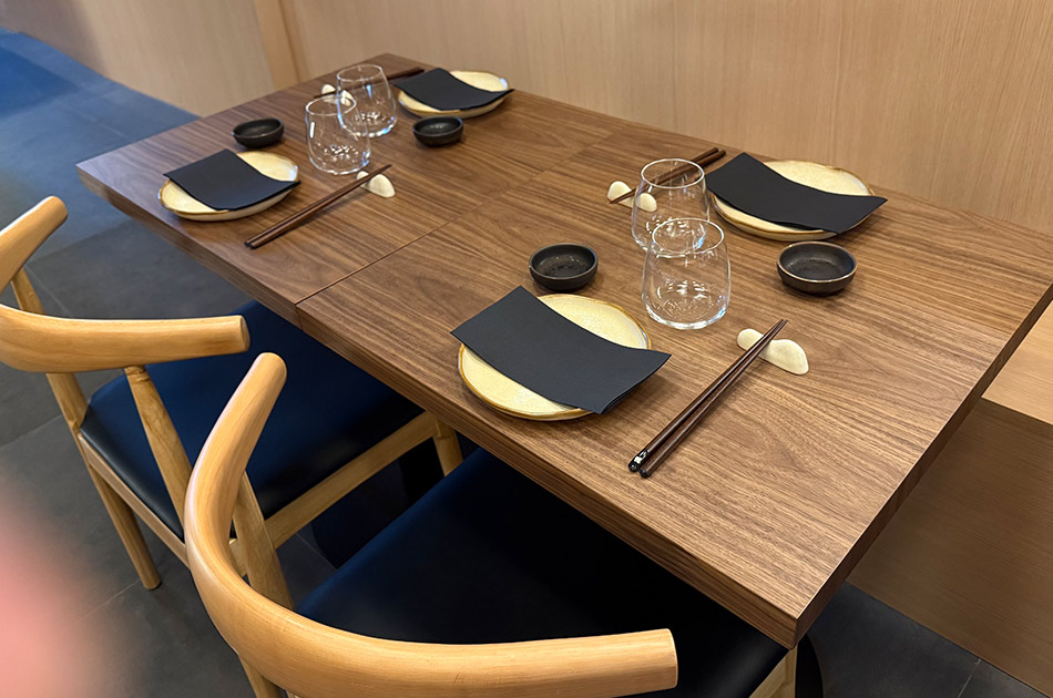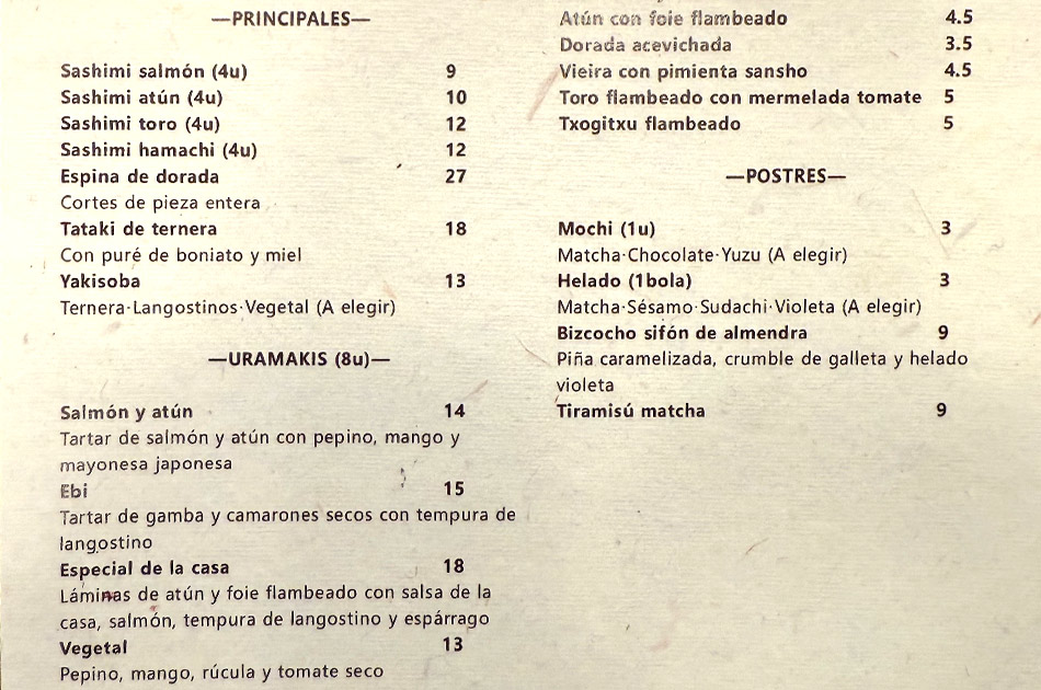 Este nuevo restaurante japonés, que acaba de abrir por Tribunal, no busca impresionar con su local, sino con las delicias niponas que van llegando a la mesa: cangrejo de concha blanda frito (sabrosísimo), carpaccio de hamachi (el corte, finísimo, se te deshace en la boca), nigiri de salmón (con un puntito cítrico), handroll de atún (picantito y jugoso) y uramaki con foie y espárragos (una delicia). Vamos, que nos pusimos las getas. Desliza las flechas para ver la carta completa.