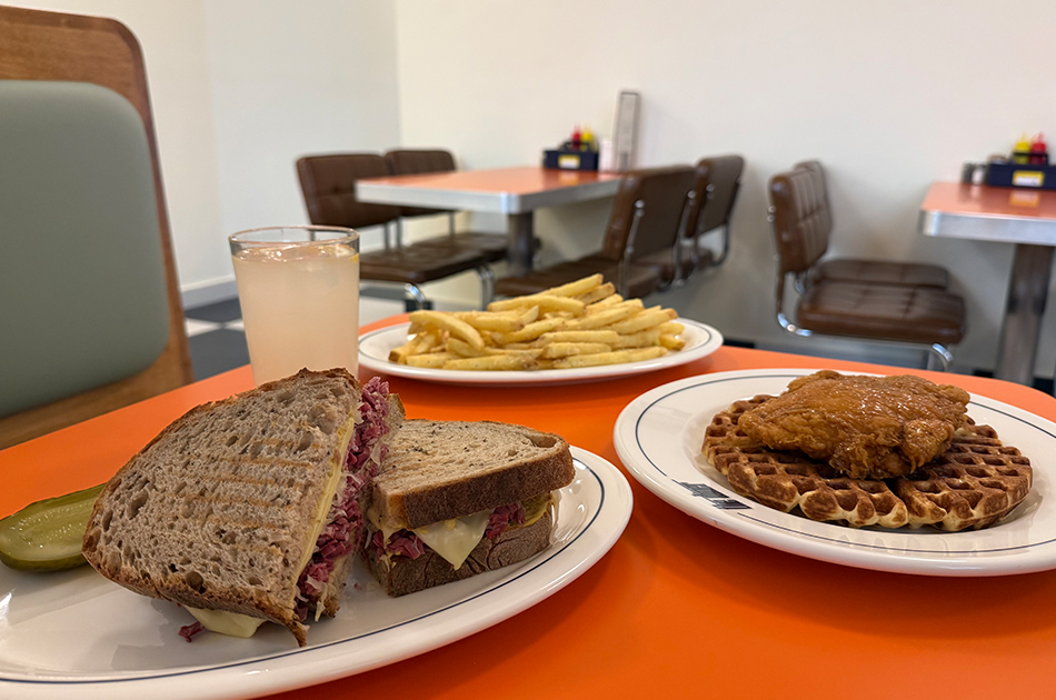 Nosotras pedimos waffles con pollo frito y sirope (te traen la jarrita aparte para que los bañes bien), el sándwich Reuben con ternera, quesito y mostaza (métele el pepinillo dentro sí o sí para darle jugosidad), patatas fritas (te sirven una ración generosa por 3,50 €) y una limonada casera para acompañar.